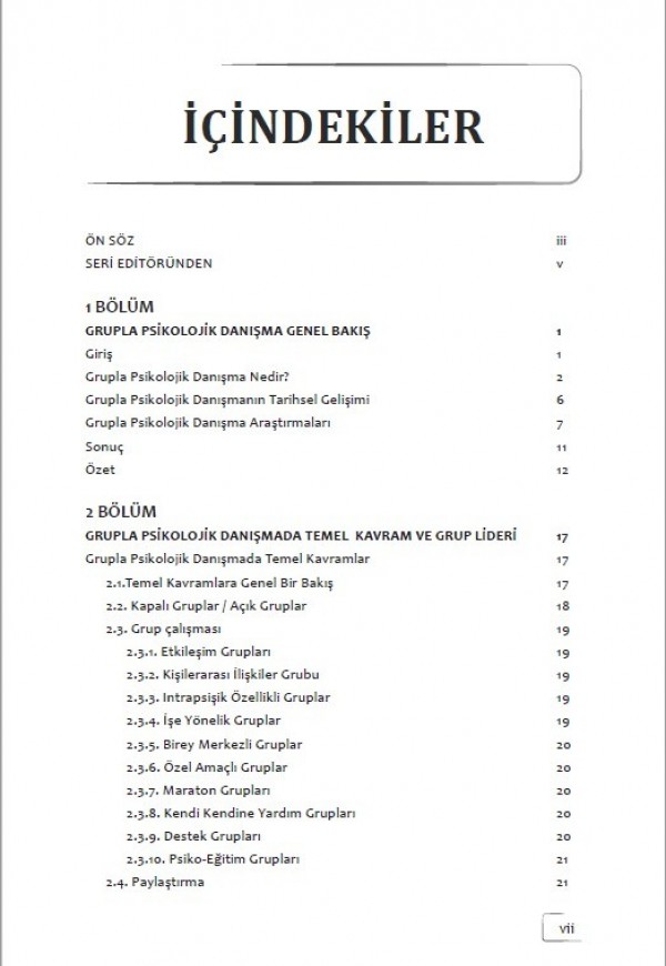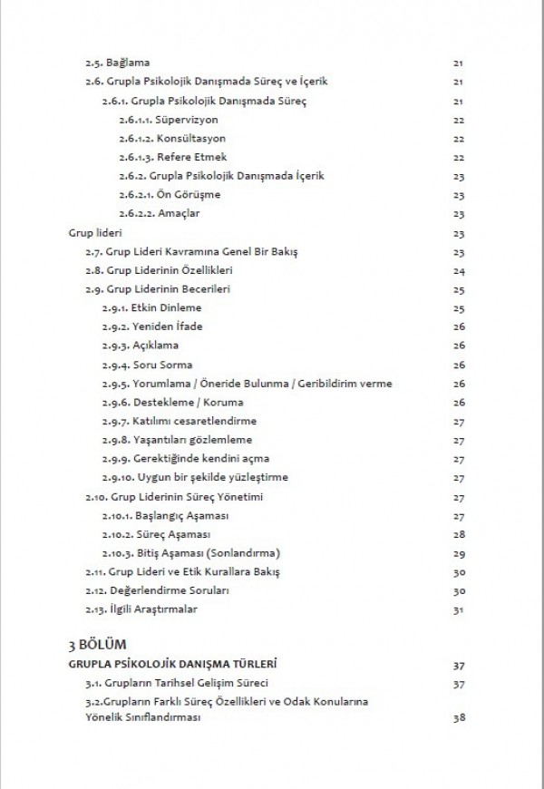Grupla Psikolojik Danışmanlık adlı kitap, 10 bölümden oluşmaktadır. Kitabın bölümleri; Grupla psikolojik danışmanlığa genel bir bakış, Grupla Psikolojik Danışmada Temel kavramlar, Danışma türleri, Grup özellikleri ve planı, Grupla Psikolojik Danışmada terapötik güçler, Grupla Psikolojik Danışmada direnç ve transferans, Grupla Psikolojik Danışmada grubun evreleri, Grupla Psikolojik danışma güçlüğü, Grupla Psikolojik Danışmada Alıştırmalar ve Grupla Psikolojik Danışmada Etik olarak bilgiler sunulmaktadır.