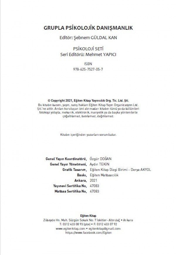Grupla Psikolojik Danışma adlı kitap Lisans ve Lisansüstü eğitimde öğrenim gören öğrencilerin yeterliliklerini attırmak için geliştirilmiştir. Grupla yapılan Psikolojik danışma, Psikoloji, Rehberlik ve Psikolojik Danışma, Rehabilitasyon merkezleri, Aile danışmanlığı ve Sosyal hizmet alanlarında çalışan kişilerin mesleki uygulamalarındaki başvurdukları etkili bir psikolojik yardım yaklaşımıdır.