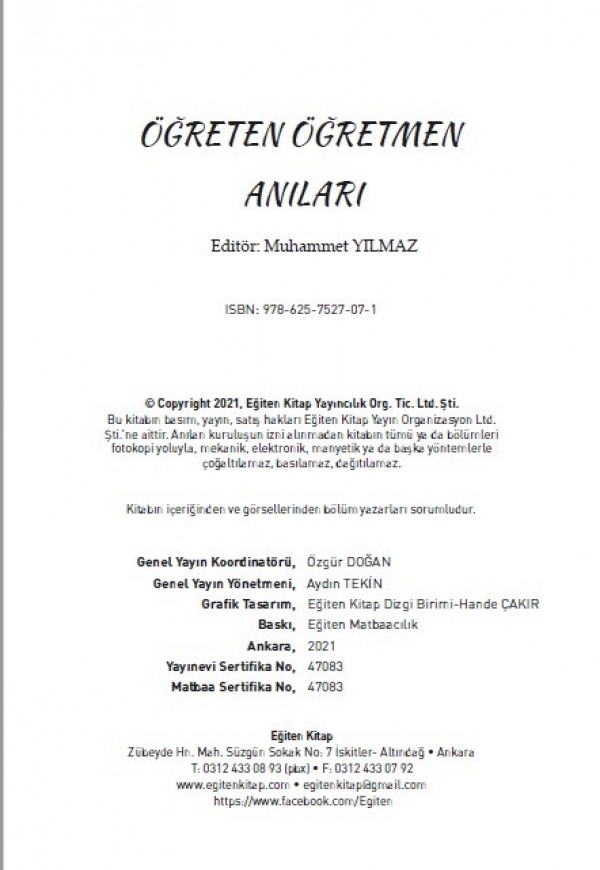 Eğitime dair teorik bilgilerin vücut bulmuş hali diyebileceğim Öğreten Öğretmen Anıları kitabımızı; yolu okuldan geçen, okul yaşantısını yakından tanımak isteyen, olayların öğretmen tarafından nasıl yaşanıp bu olaylar karşısında öğretmenin neler hissettiğini bilmek isteyen herkesin beğeniyle okuyacağına ve kendi çıkarımlarını yapacağına inanıyorum.