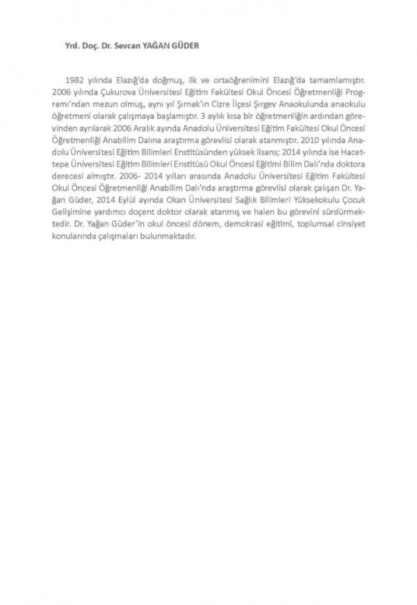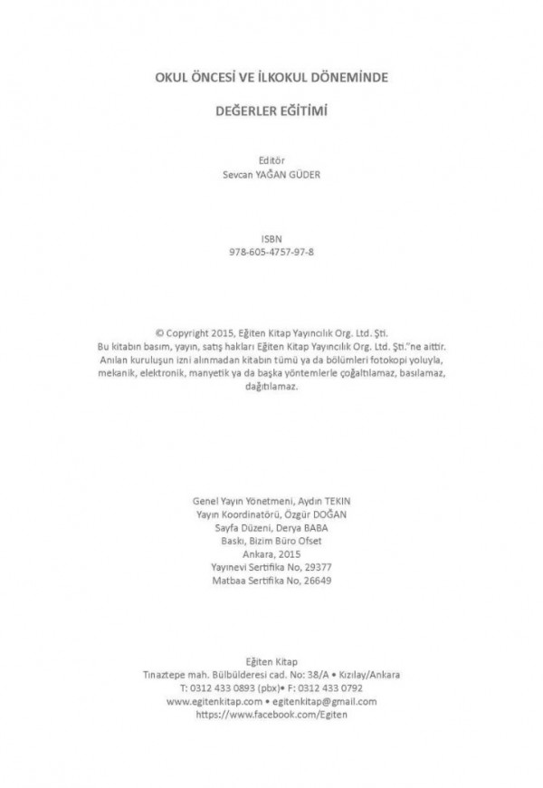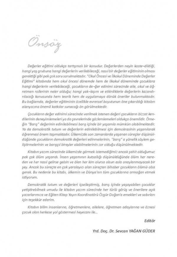 Değerler eğitimi oldukça tartışmalı bir konudur. Değerlerden neyin kaste¬dildiği, hangi yaş grubuna hangi değerlerin verilebileceği, nasıl bir değerler eğitiminin olması gerektiği gibi pek çok soru sorulmaktadır. "Okul Öncesi ve İlkokul Döneminde Değerler Eğitimi” kitabında hem okul öncesi dönemde hem de ilkokul döneminde çocuklara hangi değerlerin verilebileceği, çocukların de¬ğer edinimi sürecinde aile, okul ve öğretmen rollerinin neler olduğu; hangi yak¬laşım ve etkinliklerle değerlerin kazandırılacağı konusunda hem teorik hem de uygulamaya dönük öneriler bulunmaktadır. Bu bağlamda, değerler eğitiminin özellikle evrensel boyutunun öne çıkarıldığı kitabın alanyazına önemli katkılar sunacağı ön görülmektedir.