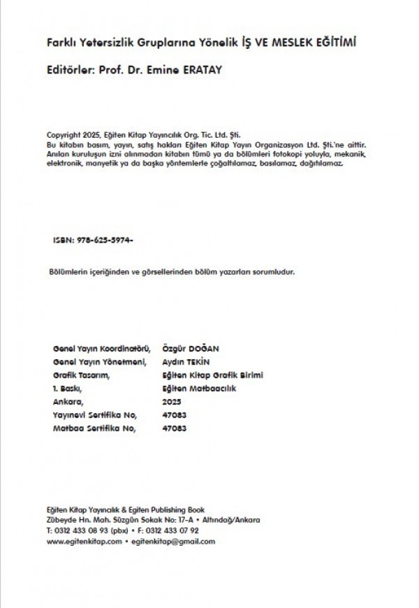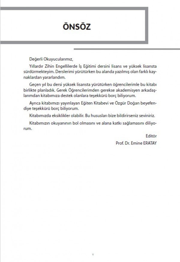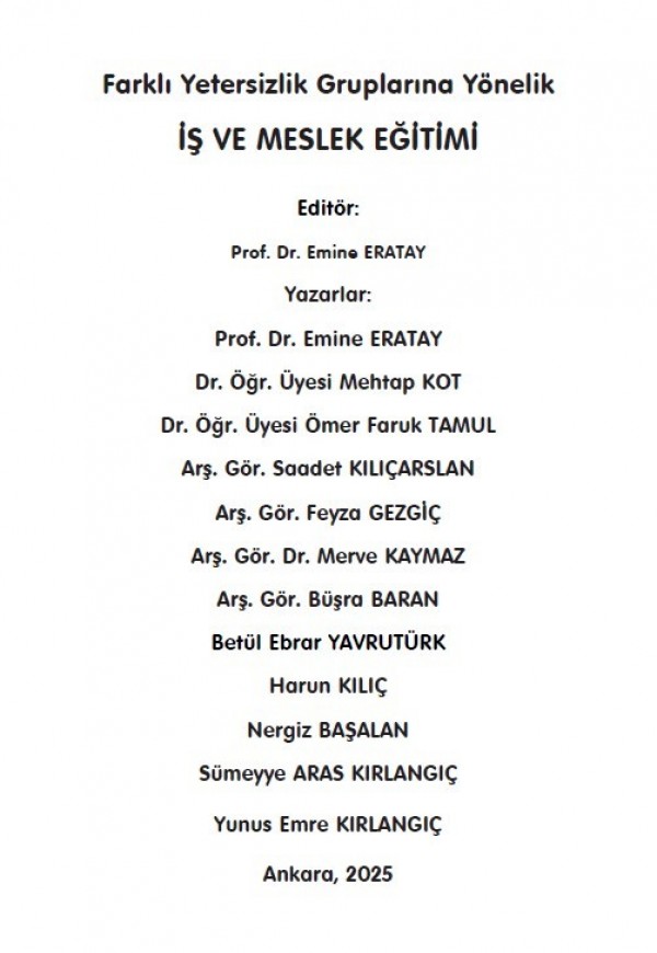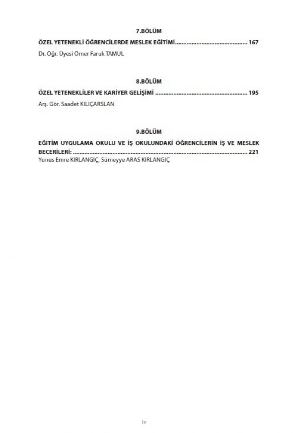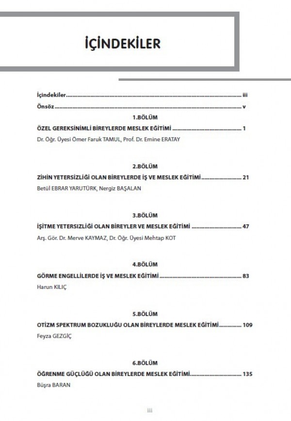 Kitabımız dokuz bölümden oluşmaktadır. İlk bölümde genel anlamda iş eğitimi, iş eğitiminin yasal çerçevesine ve bu konudaki uygulamalara yer verdik. İkinci bölümde zihin yetersizliği olan bireylerde iş ve meslek eğitimini inceledik. Üçüncü bölümde işitme yetersizliği olan bireylerde iş ve meslek eğitimini ele alırken; dördüncü bölümde görme engeli olan bireylerde iş ve meslek eğitimini irdeledik. Kitabımızın beşinci bölümünde otizm spektrum bozukluğu olan bireylerde; altıncı bölümde ise öğrenme güçlüğü olan bireylerde iş ve meslek eğitimine yer verdik. Bu arada özel eğitimin bir alanı olan özel yeteneklileri de unutmadık ve kitabımızın yedinci bölümünde onlara da yer verdik. Kitabımızın sekizinci bölümünde özel yeteneklilerin kariyer gelişimine yer verdik. Kitabımızın dokuzuncu ve son bölümünde ise yüksek lisansta zihin engellilerde iş ve meslek eğitimi dersini alan öğrencilerimizle gerçekleştirdiğimiz araştırmanın verilerini özetledik.