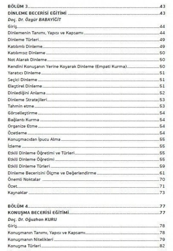 bölümü Türkçe dersi öğretim programı ve ders planlaması, onuncu bölümü Türkçe öğretiminde strateji, yöntem, teknik ve araç gereç kullanımı ile öğrenme ortamlarının düzenlenmesi ve on birinci bölümü Türkçe öğretiminde ölçme ve değerlendirme konularına odaklanmaktadır.