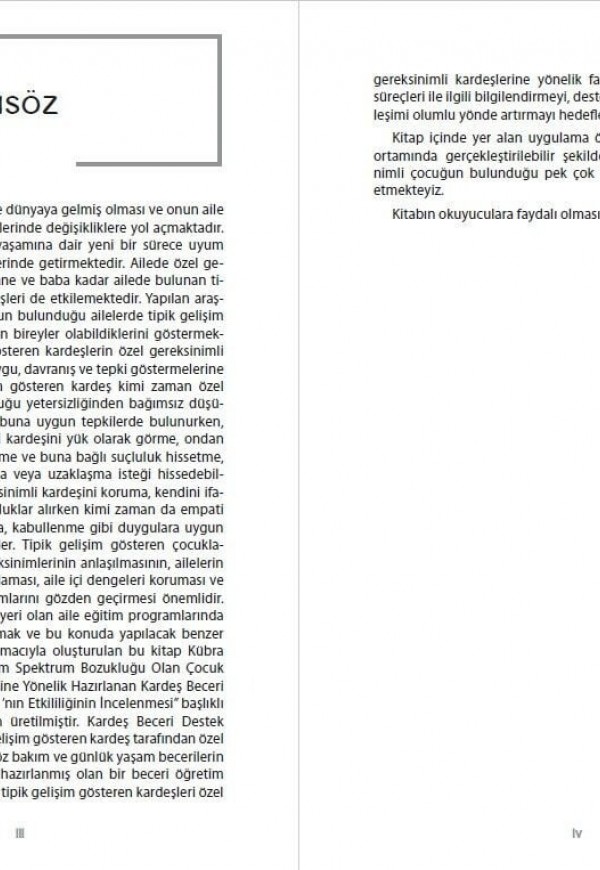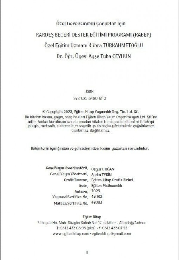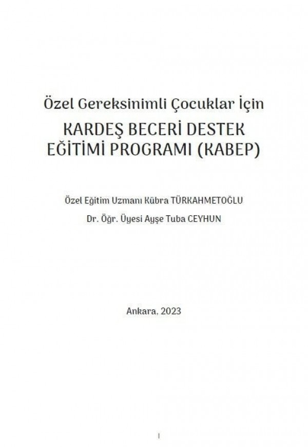 Özel eğitim alanında önemli bir yeri olan aile eğitim programlarında kardeşlerin önemine vurgu yapmak ve bu konuda yapılacak benzer uygulamalara rehberlik etmek amacıyla oluşturulan bu kitap Kübra Türkahmetoğlu (2022)’nun "Otizm Spektrum Bozukluğu Olan Çocuk ve Tipik Gelişim Gösteren Kardeşine Yönelik Hazırlanan Kardeş Beceri Destek Eğitimi Programı (KABEP) ’nın Etkililiğinin İncelenmesi” başlıklı yüksek lisans tez çalışmasından üretilmiştir. Kardeş Beceri Destek Eğitimi Programı (KABEP), tipik gelişim gösteren kardeş tarafından özel gereksinimli kardeşe uygulanan öz bakım ve günlük yaşam becerilerin öğretimine yardımcı olmak için hazırlanmış olan bir beceri öğretim programıdır. Bu eğitim programı, tipik gelişim gösteren kardeşleri özel gereksinimli kardeşlerine yönelik farkındalık oluşturmayı, öğrenme süreçleri ile ilgili bilgilendirmeyi, destek olmaya ve kardeşler arası etkileşimi olumlu yönde artırmayı hedeflemektedir.