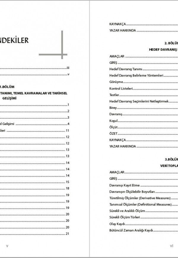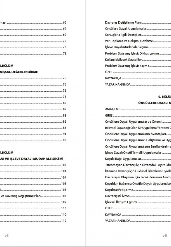verilmiştir. Altıncı bölümde öncüllere dayalı uygulamalar, yedinci bölümde pekiştirme, sekizinci bölümde ayrımlı pekiştirme, dokuzuncu bölümde uyaran kontrolü ve güdüsel işlemler, onuncu bölümde şekil verme, on birinci bölümde zincirleme, on ikinci bölümde sembol pekiştirme, on üçüncü bölümde izlerlik sözleşmesi, on dördüncü bölümde kendini yönetme, on beşinci bölümde sönme, on altıncı bölümde ceza ve on yedinci bölümde kalıcılık ve genelleme konuları açıklanmıştır.