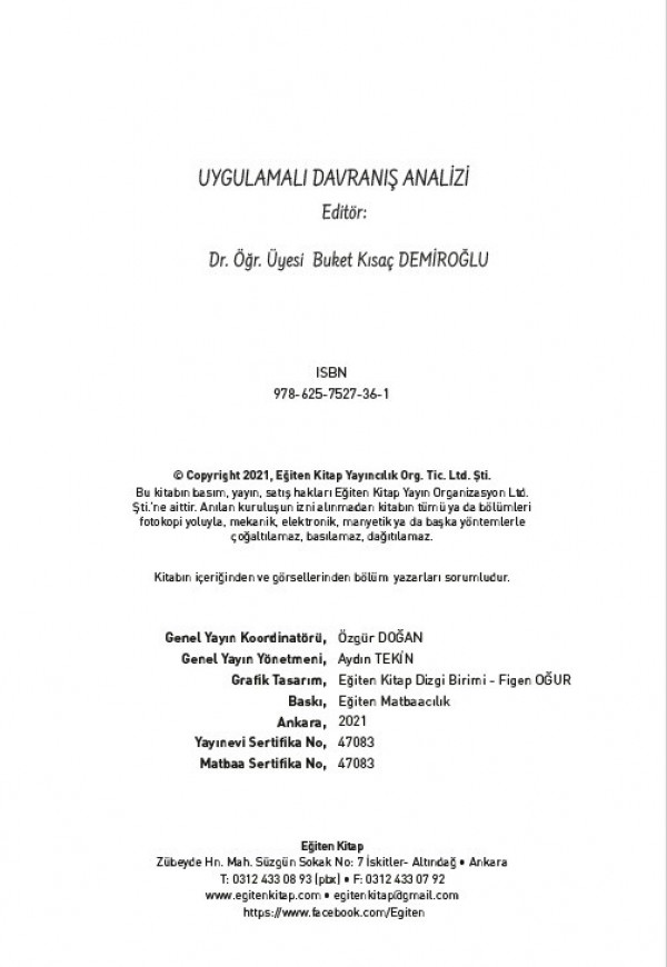 Kitabımızın lisans düzeyinde okutulan uygulamalı davranış analizi dersinin içeriğine uygun olmasının yanında lisans üstü düzeyde öğrenim görmekte olan öğrencilere de katkı sağlayacağını düşünmekteyim.