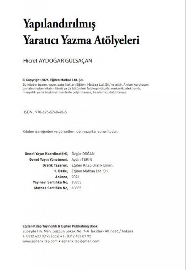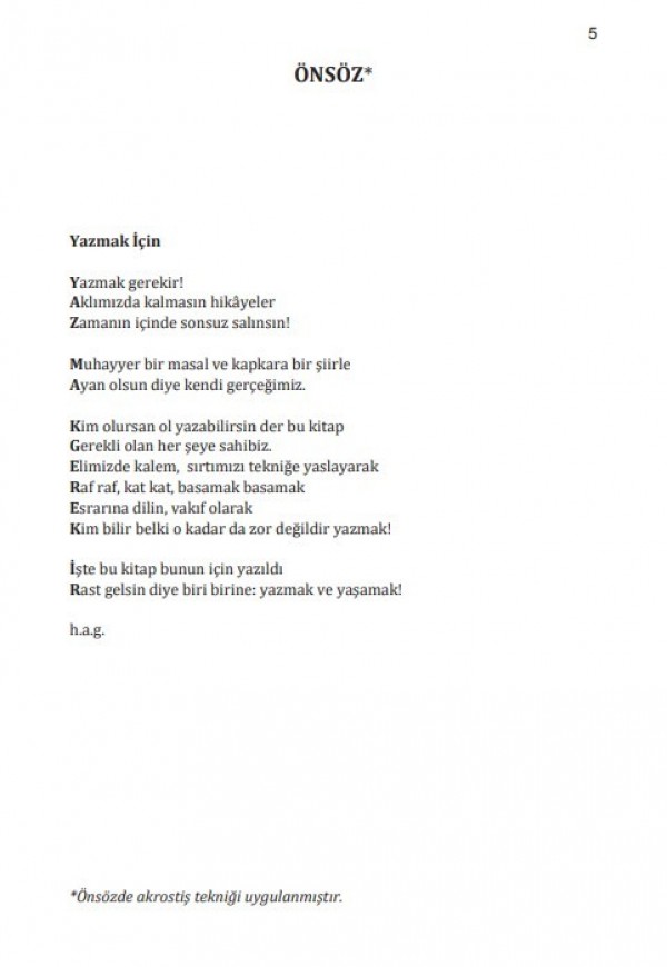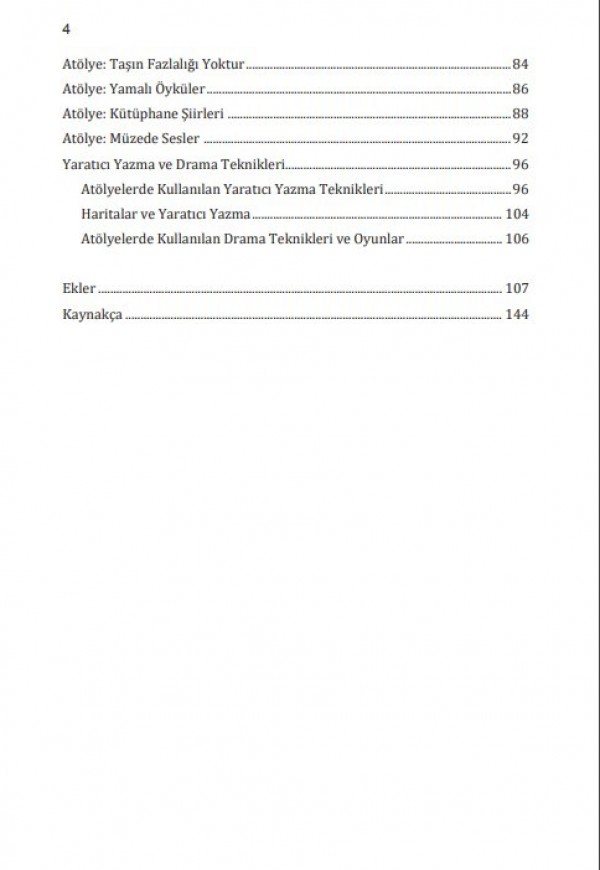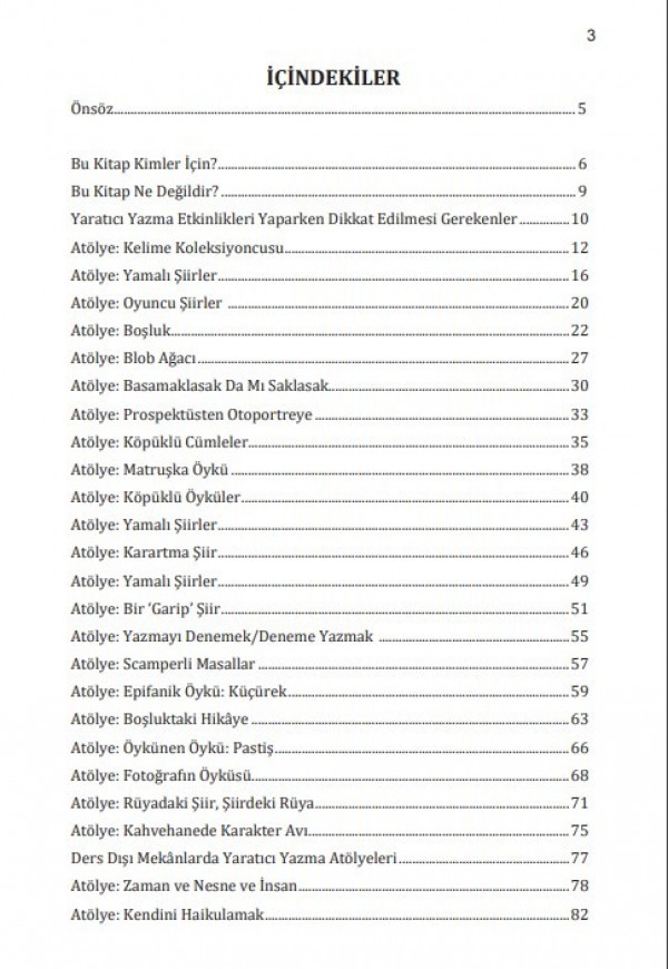 Kitapta yer alan yaratıcı yazma atölyeleri, yazma tekniklerinin bir bağlam içinde nasıl kullanılabileceğini göstererek, sınıf içi ve dışında yazma çalışmaları yapmak üzere tasarlanmıştır. Derslerinizde, atölyelerinizde bütün olarak uygulayabileceğiniz gibi, sadece bağlamınıza uygun olan etkinlikleri seçerek de kullanabilirsiniz.